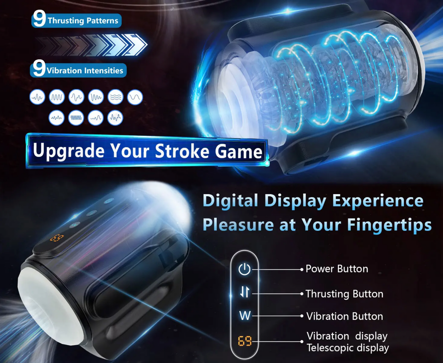 Deze automatische penis-mannelijke stroker heeft 9 unieke stootpatronen en vibratie-instellingen. De stootpatronen spelen in op verschillende voorkeuren, of u nu van langzame en zachte stoten houdt of van snelle en intense bewegingen. Bovendien richten de strategisch geplaatste vibraties zich op gevoelige gebieden, waardoor de sensaties worden geïntensiveerd en er een scala aan opties wordt geboden, van subtiele vibraties tot krachtige pulseringen.